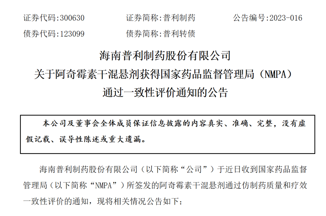 近期,普利制藥生產(chǎn)的普利舒奇阿奇霉素干混懸劑,共計(jì)3個(gè)規(guī)格,通過國家藥監(jiān)局審批,仿制藥質(zhì)量和療效一致性評價(jià)批準(zhǔn)上市。
