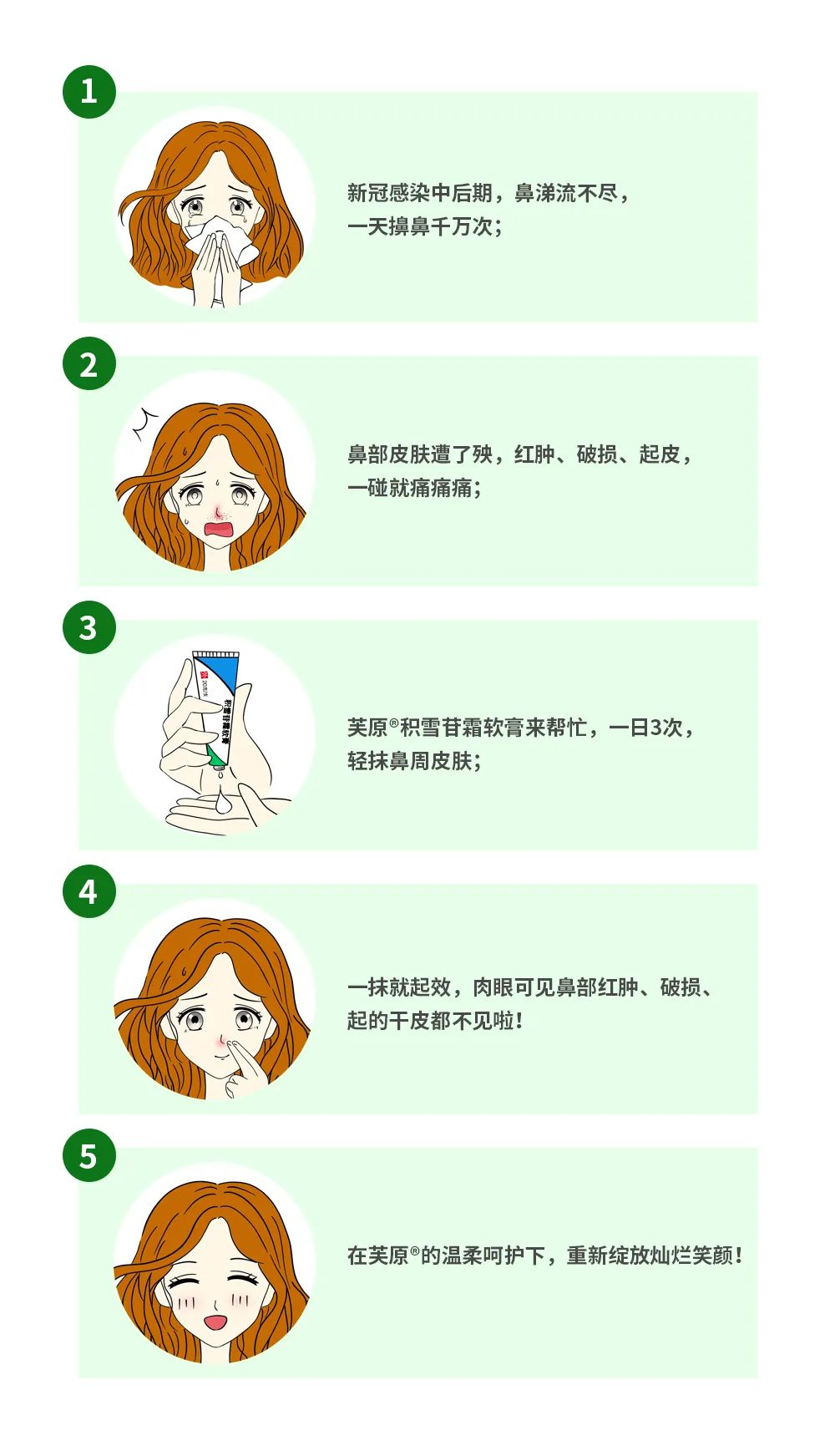 新冠感染中后期,面部和鼻部皮膚遭了殃,紅腫、破損、起皮,芙原積雪苷霜軟膏來幫忙,一日3次,一抹就起效,肉眼可見鼻部紅腫、破損、面部起的干皮都不見啦!