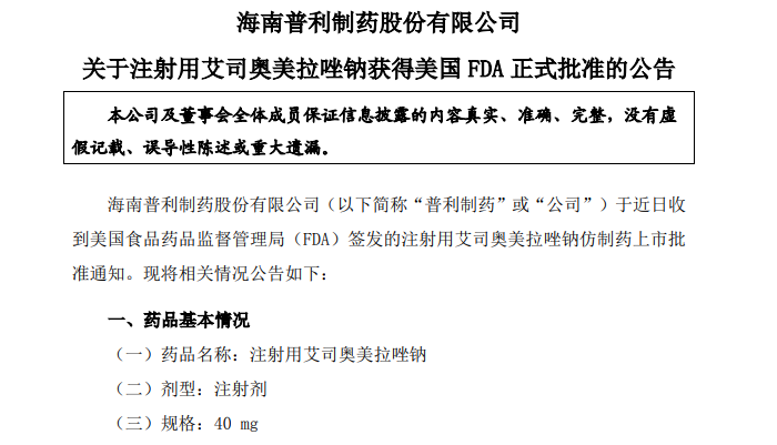 2.注射用艾司奧美拉唑鈉獲得美國(guó) FDA正式批準(zhǔn);